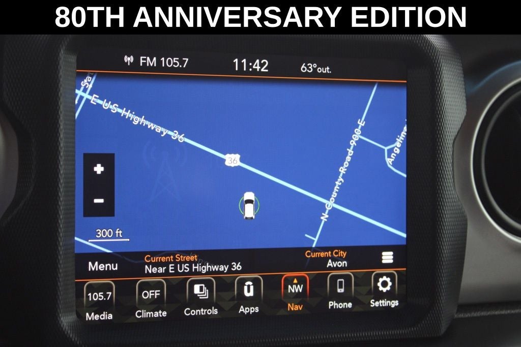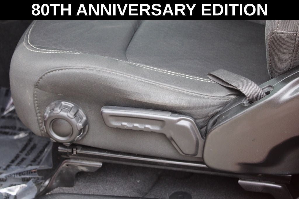 Exterior-wise, this Jeep Gladiator Sport stands out with its striking Firecracker Red Clearcoat paint, complemented by the bold body-color fender flares and grille. The 80th Anniversary edition badges and accents add a touch of exclusivity and style.