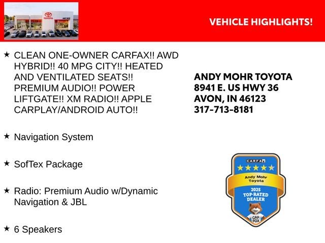 - CLEAN ONE-OWNER CARFAX!! AWD HYBRID!! 40 MPG CITY!! HEATED AND VENTILATED SEATS!! PREMIUM AUDIO!! POWER LIFTGATE!! XM RADIO!! APPLE CARPLAY/ANDROID AUTO!!